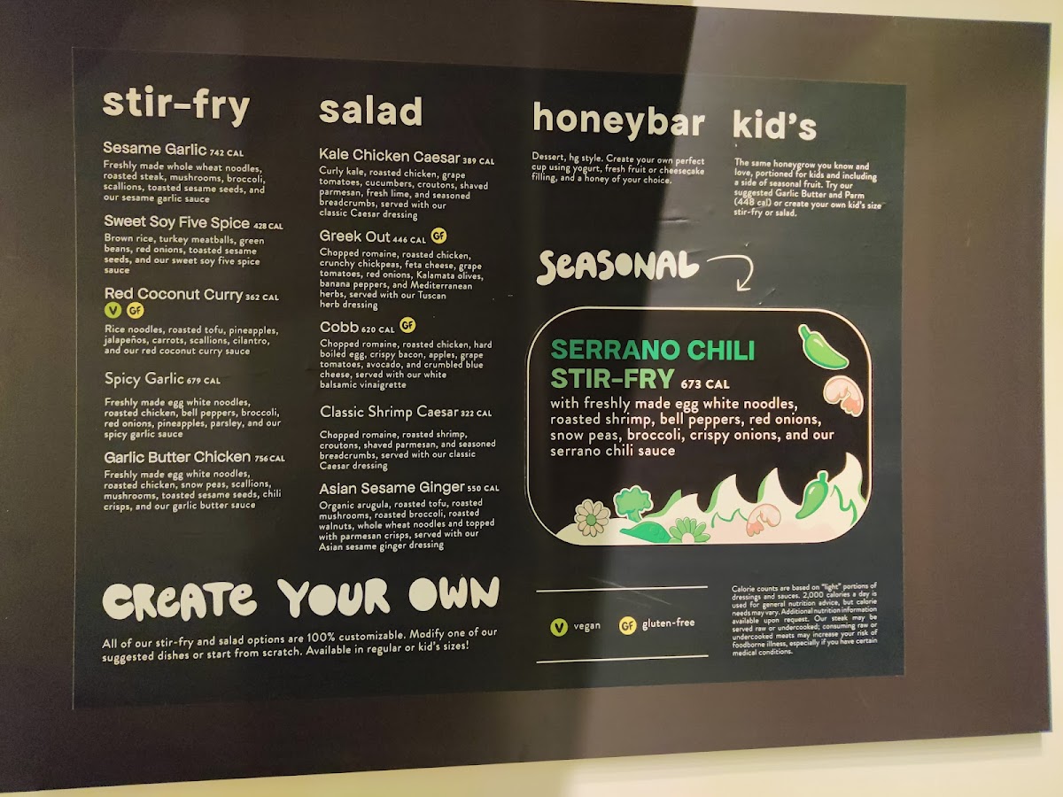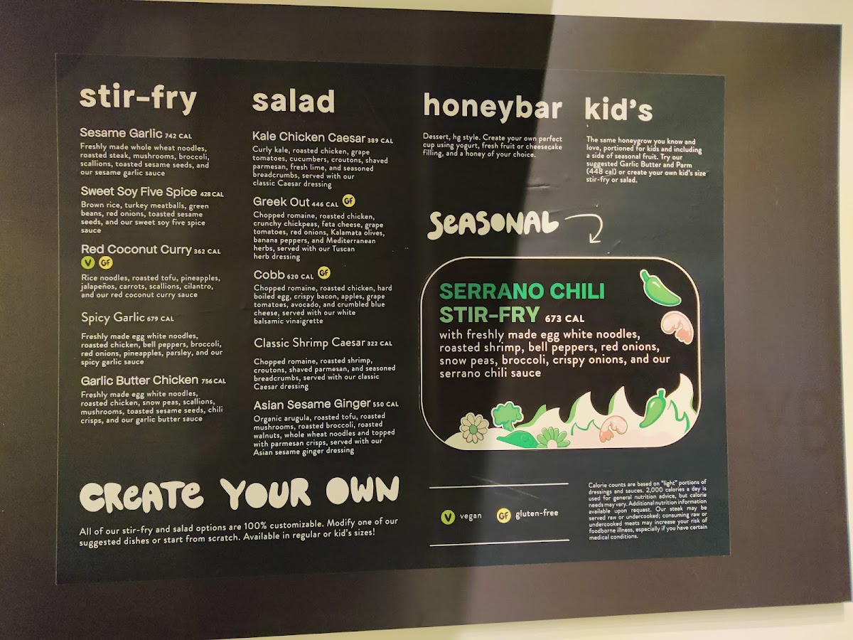 Includes your choice of 2 small stir-fry platters, 1 small salad platter and individual honeybars